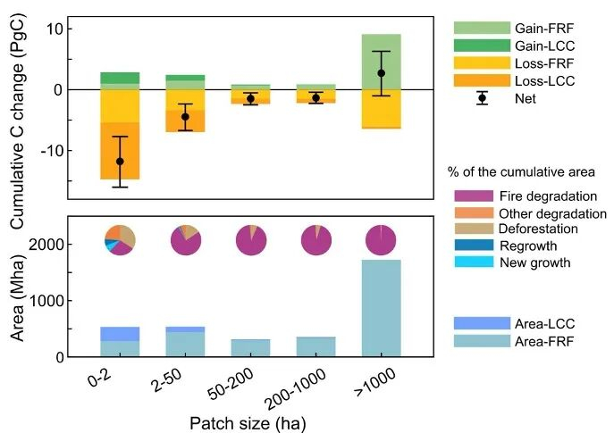 该研究显示,受干扰的热带干旱森林保持碳中性,而受干扰的热带湿润森林则出现 15.6±3.7 Pg 的净 AGC 损失,这主要是由规模小但持续存在的毁林开荒驱动的。虽然小规模(小于 2 公顷)毁林事件仅影响约 5% 的受干扰区域,但由于持续的土地利用转变导致森林无法再生,这些事件造成了约 56% 的碳损失。相比之下,大型火灾引发的碳损失被火灾后的长期恢复所抵消。