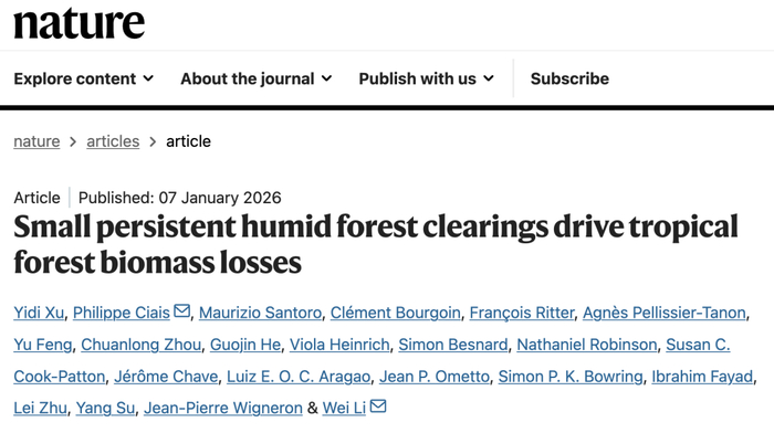 2026 年 1 月 7 日,清华大学李伟副教授、法国气候与环境科学实验室 Philippe Ciais 教授教授作为通讯作者(徐伊迪为论文第一作者),在国际顶尖学术期刊 Nature 上发表了题为:Small persistent humid forest clearings drive tropical forest biomass losses 的研究论文。