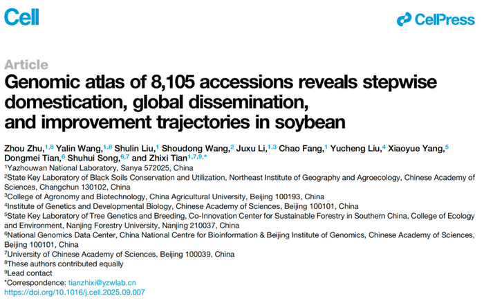 近日,崖州湾国家实验室大豆种子创新团队首席科学家田志喜作为通讯作者(博士后朱舟、王亚琳作为共同第一作者),在国际顶尖学术期刊 Cell 上发表了题为:Genomic atlas of 8,105 accessions reveals stepwise domestication, global dissemination, and improvement trajectories in soybean 的研究论文,该论文被选为封面论文。