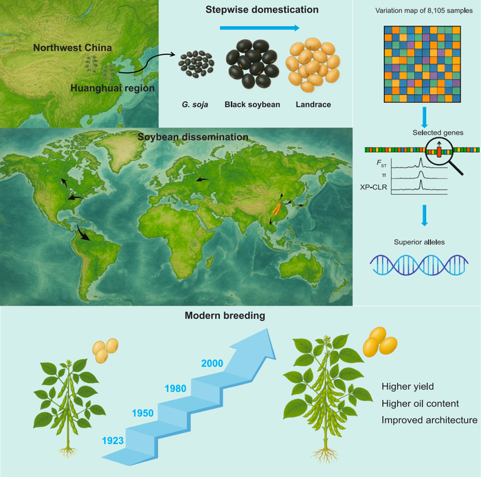 对来自不同地理区域和历史时期的种质资源进行比较,发现了许多在大豆全球传播过程中促进性状改良和环境适应的受选择基因,为未来大豆品质改良提供了新的分子靶点,并揭示了中国大豆改良过程中育种重点的时序变化——建国初期以培育高蛋白大豆为重点,而近年来更强调高产、高油和抗逆性大豆。