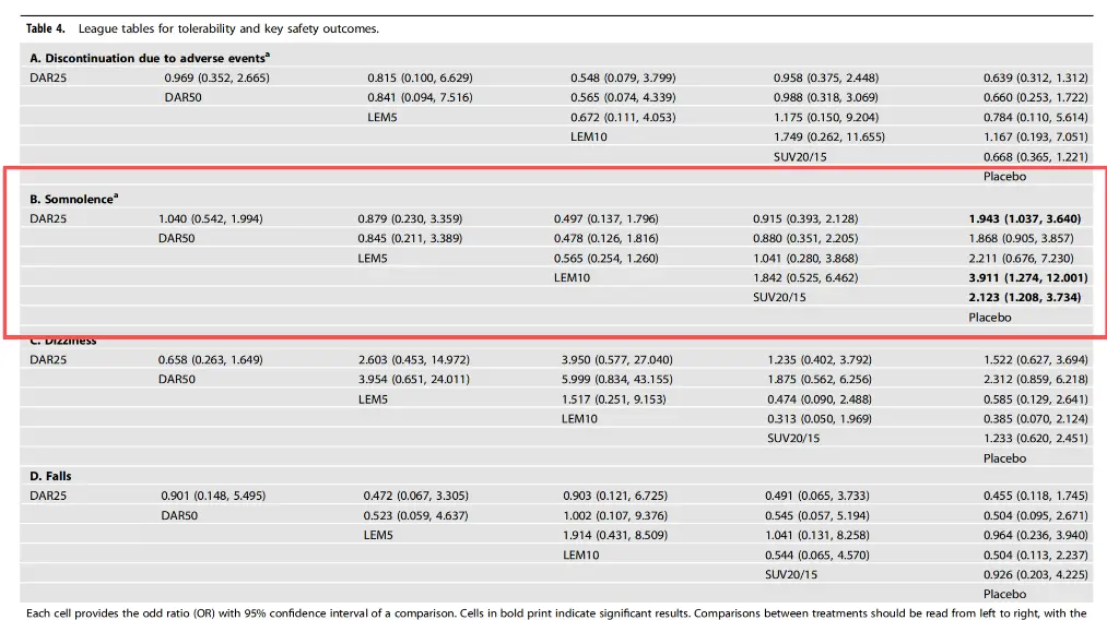 值得注意的是,在对数据结果进行“敏感性分析”后,澄清了莱博雷生虽然半衰期大于达利雷生,但莱博雷生10mg在嗜睡风险上与其它DORAs药物无显著差异,适合第二天对日间清醒要求较高的人群。